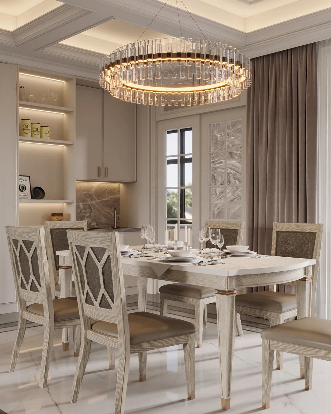 在华丽而精致的餐厅中,仿古白的餐桌椅搭配通透的水晶高脚杯,两者交相辉映,用餐仪式感十足。墙面的护墙板和酒柜呈现一字型设计,一方面增添空间整体的丰盈感,还强调出个性现代的轻奢布局。