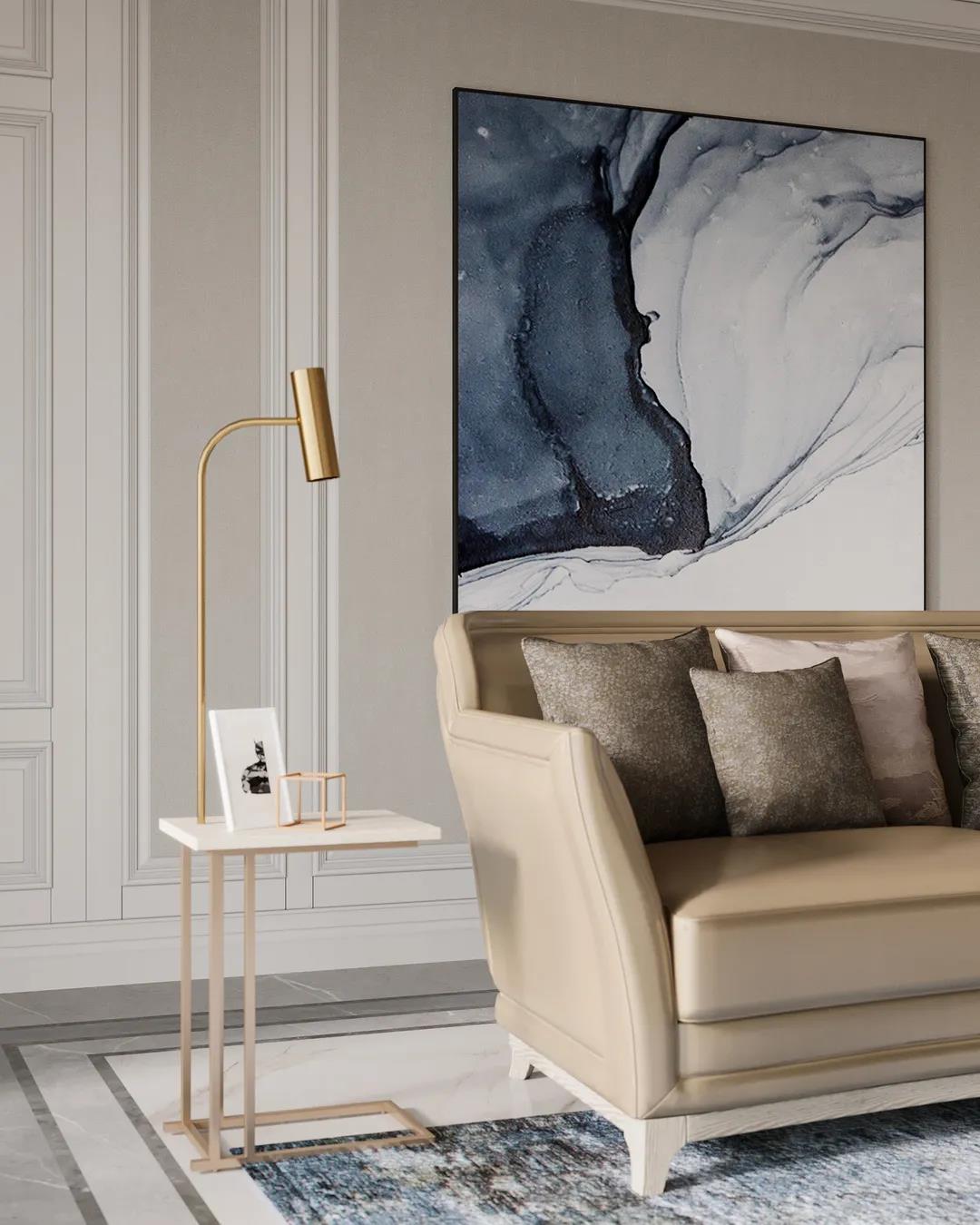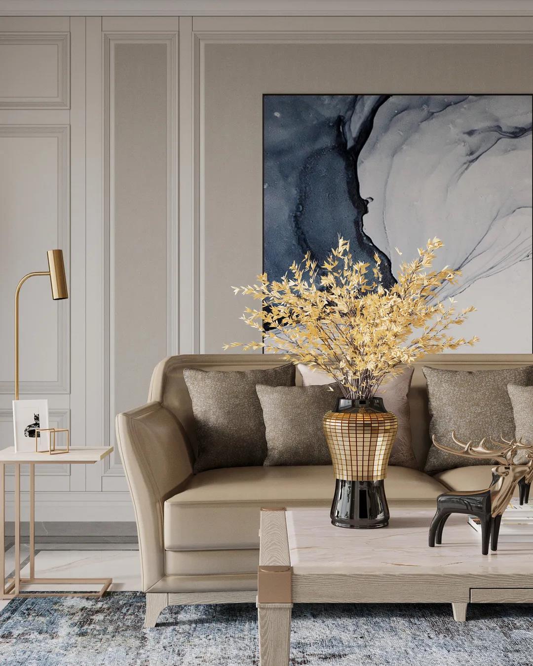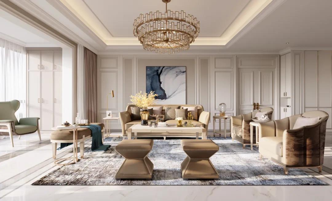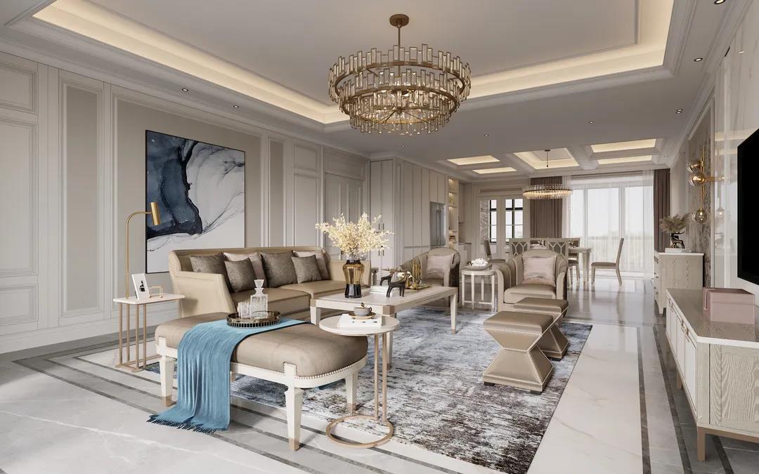本案定位美式轻奢风格,设计师提取了业主喜欢的颜色添加至空间中,并运用金属元素渗透到每一个空间,统一色调。在设计上,格局大而不空,以优美线条雕琢空间语言,材质肌理间的碰撞融合,打造出层次丰富的艺术感。