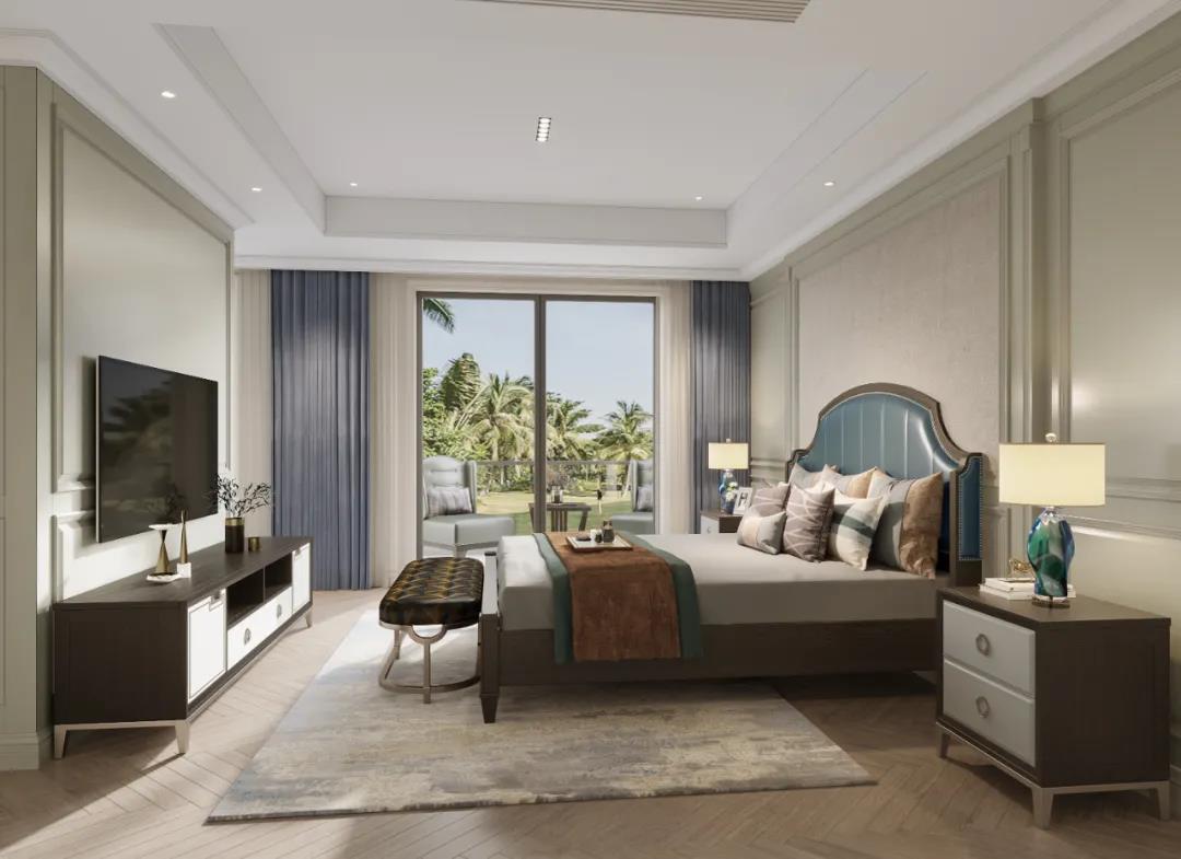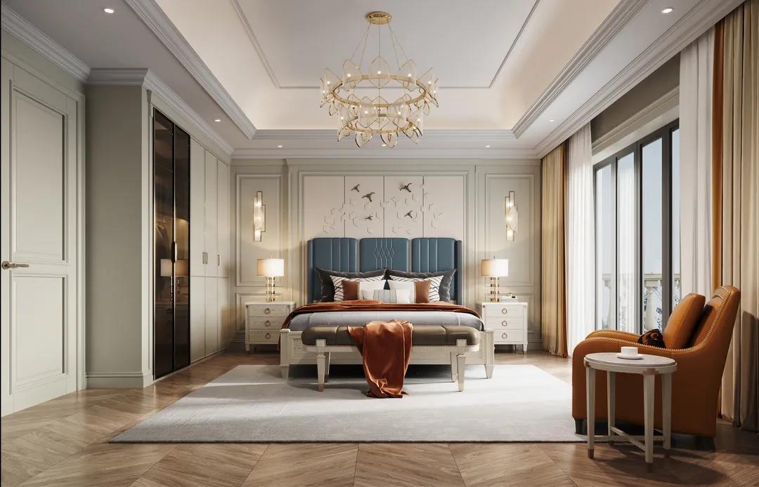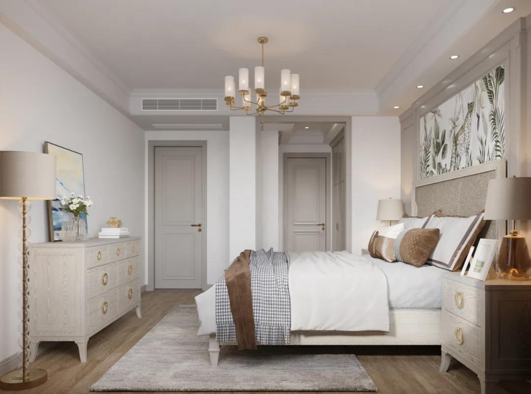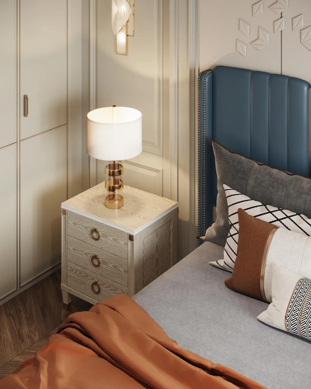 主卧以线条元素做主导,软包的床头墙面充满安全感,浮雕的造型给空间布局带来了极佳的层次感,以现代美式轻奢框架为主题,融入了美式灵动的线条,让整个卧室既有时尚质感,又有时光打磨后的稳重。