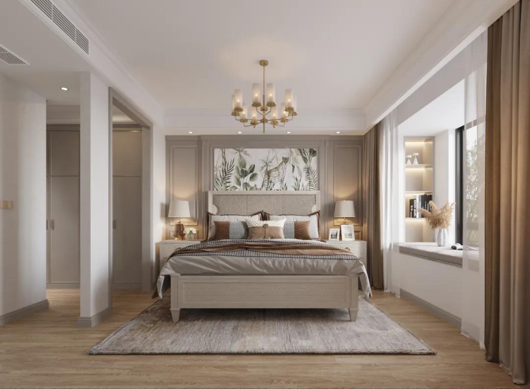 卧室的墙面采用高级灰延展,精美的护墙纹理绵延婉转在静谧的空间,床屏背景展现着春秋的盎然生机,伴随秋风驻足在这间温馨之家,悠悠扬扬。